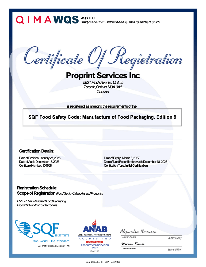 The SQF program is recognized in more than 40 countries, with over 14,000 certified sites worldwide. Proprint is now one of them.